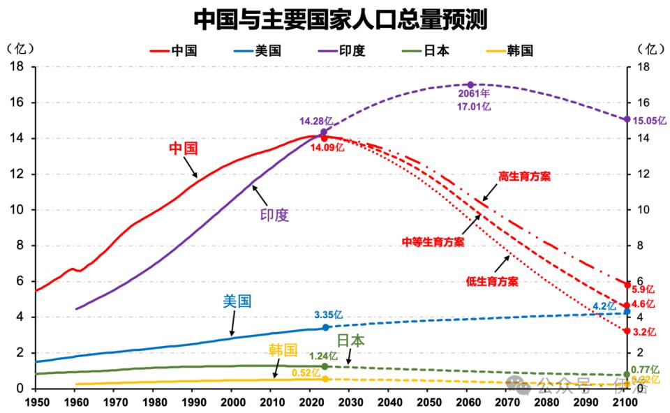 若总和生育率保持目前 1.05 的水平不变(中等生育方案),预计我国人口总量将在 2027 年跌破 14 亿,2035 年为 13.5 亿,2041 年跌破 13 亿,2050 年为 11.88 亿。2025-2050 年平均每年净减少约 850 万,2050-2100 年平均每年净减少 1459 万。