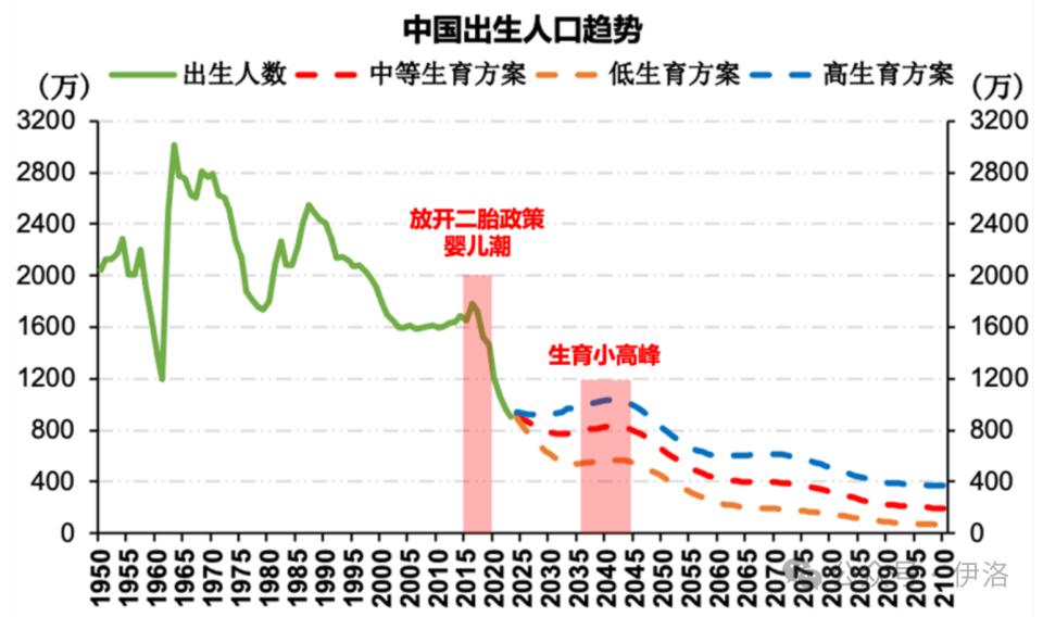 在高生育方案情景下,2025-2050 年,年平均出生人数将回升至 958 万,其中 2037-2044 年预计上升至 1000 万以上。