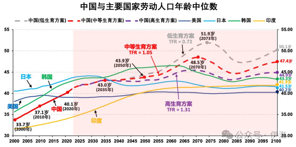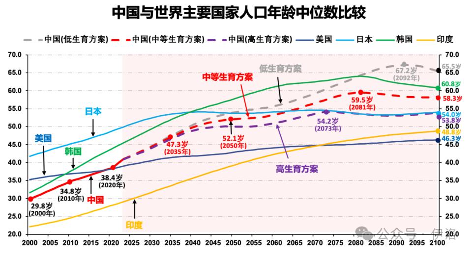 在中等生育方案情景下,预计 2035 年人口年龄中位数为 47.3 岁,2050 年为 52.1 岁,2081 年达到峰值 59.5 岁。2100 年为 58.3 岁,显著高于日本(54.0 岁)、印度(48.8 岁)和美国(46.3 岁),仅比韩国(60.8 岁)低 2.5 岁。