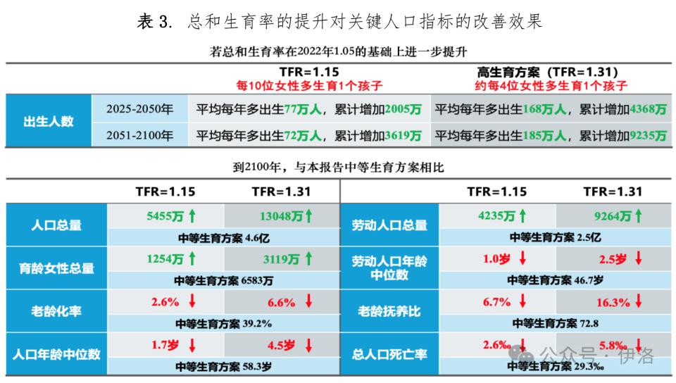 长期来看,到 2100 年,与本报告中等生育方案相比,人口总量将增加 5455 万,育龄女性规模将增加 1254 万,老龄化率将减少 2.6%,人口年龄中位数将减少 1.7 岁,劳动人口总量将增加 4235 万,劳动人口年龄中位数将减少 1 岁,老龄抚养比将减少 6.7%,总人口死亡率也将减少 2.6 ‰。