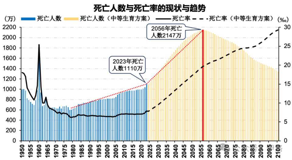 在中等生育方案情景下,2025-2100 年,每年人口死亡数与老龄人口规模呈现高度相关性(相关系数 0.94)。2023 年我国人口死亡数为 1110 万,我们预计这一规模会迅速增加,2050 年翻 0.9 倍,2075 年翻 0.7 倍,2100 年翻 0.2 倍。未来每年增加的死亡人口将会给我国的医疗系统、民政系统带来新的挑战。由于我们假定三种生育方案的各年龄段、分性别死亡率相同,因此,三种生育方案情景下的每年人口死亡规模差异很小。