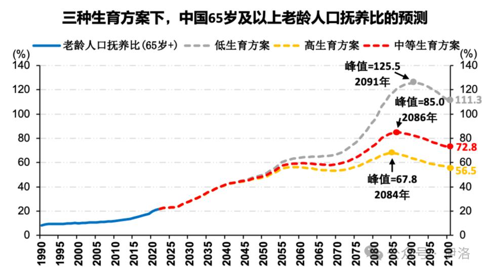在中等生育方案情景下,65 岁及以上老龄人口抚养比预计 2035 年为 35.3%,2050 年为 48.8%,2075 年为 64.0%。预计 2100 年为 72.8%,即每 1.4 个劳动者抚养一个老年人。