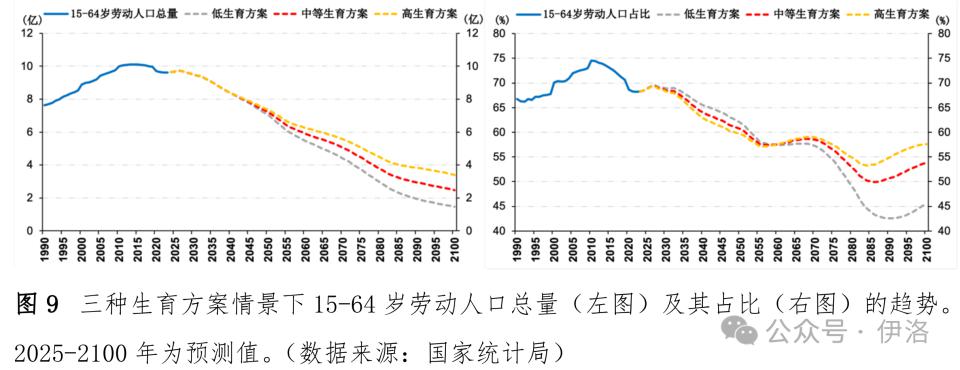 在低生育方案情景下,劳动人口总量将比中等生育方案平均每年多减少 160 万,2100 年为 1.48 亿。