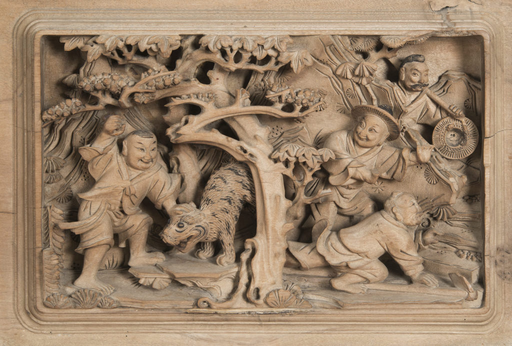 人物故事木刻八件之一:景阳冈上武松打虎 清末民初 木 高22.5×宽34厘米