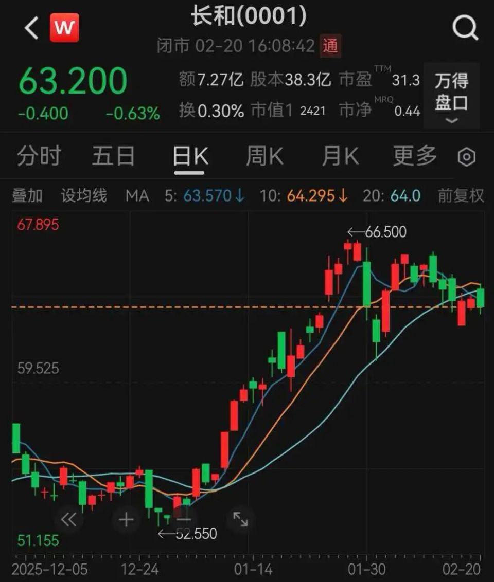 截至 2 月 20 日收盘,长和股价报 63.2 港元,跌 0.63%,总市值约为 2421 亿港元。