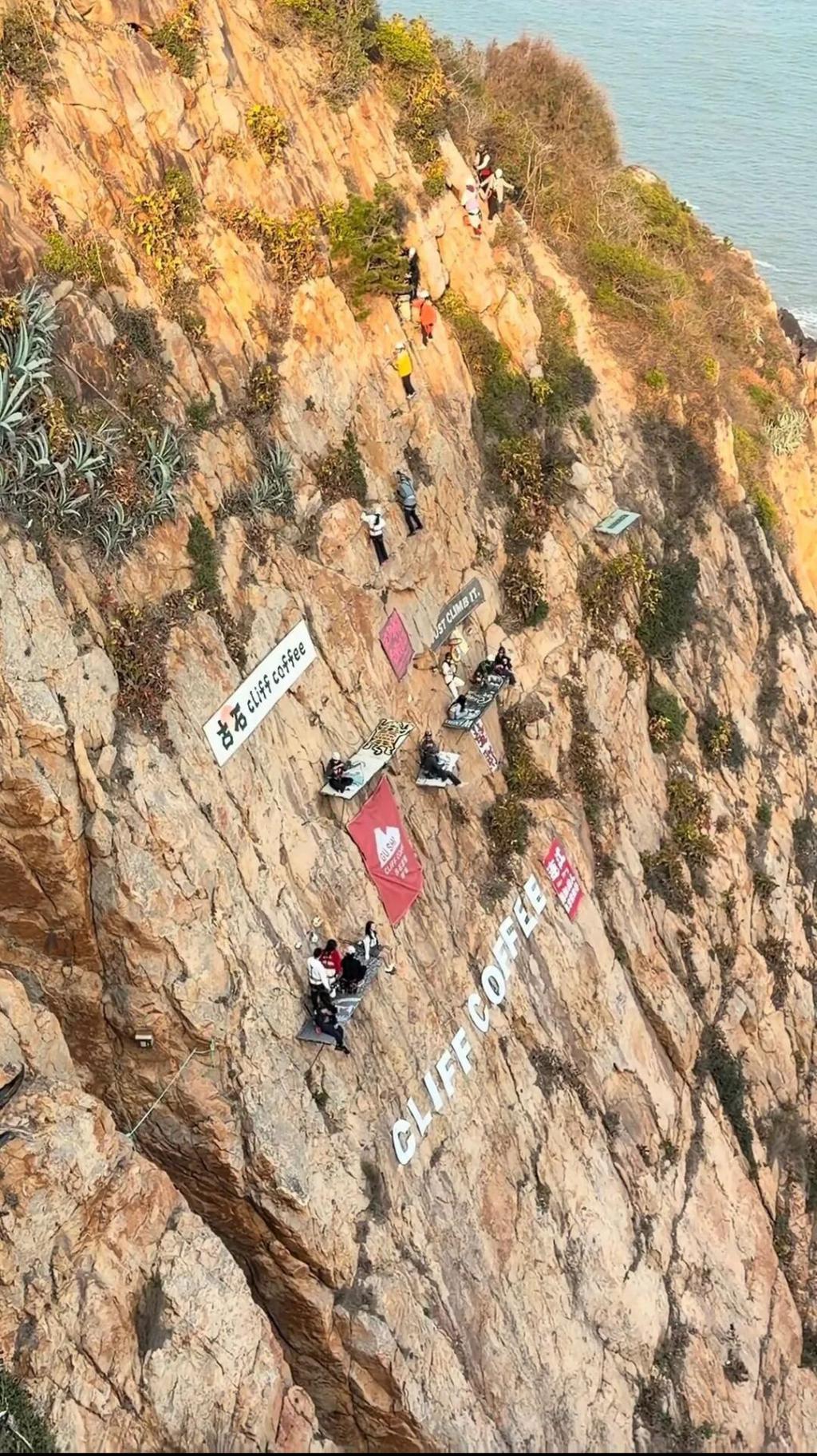 多位网友晒出的视频显示,在一处陡峭的崖壁上,不少顾客身上系着安全带,坐在几乎垂直于崖壁的 " 座位 " 上,脚下就是大海。还有系着安全带的顾客,正小心翼翼踩着崖壁上的 " 脚踏板 ",向 " 座位 " 处前进。
