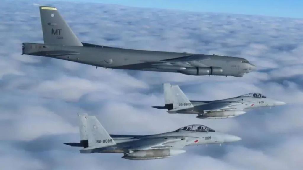 美军 B-52 轰炸机与日本航空自卫队 F-15 编队飞行