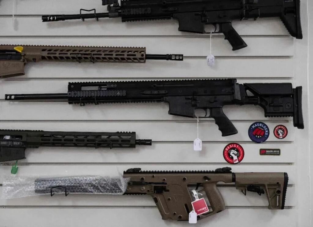 2023 年 3 月 14 日,美国马里兰州一家枪店的墙上挂着待售枪支 图:新华社 / 法新