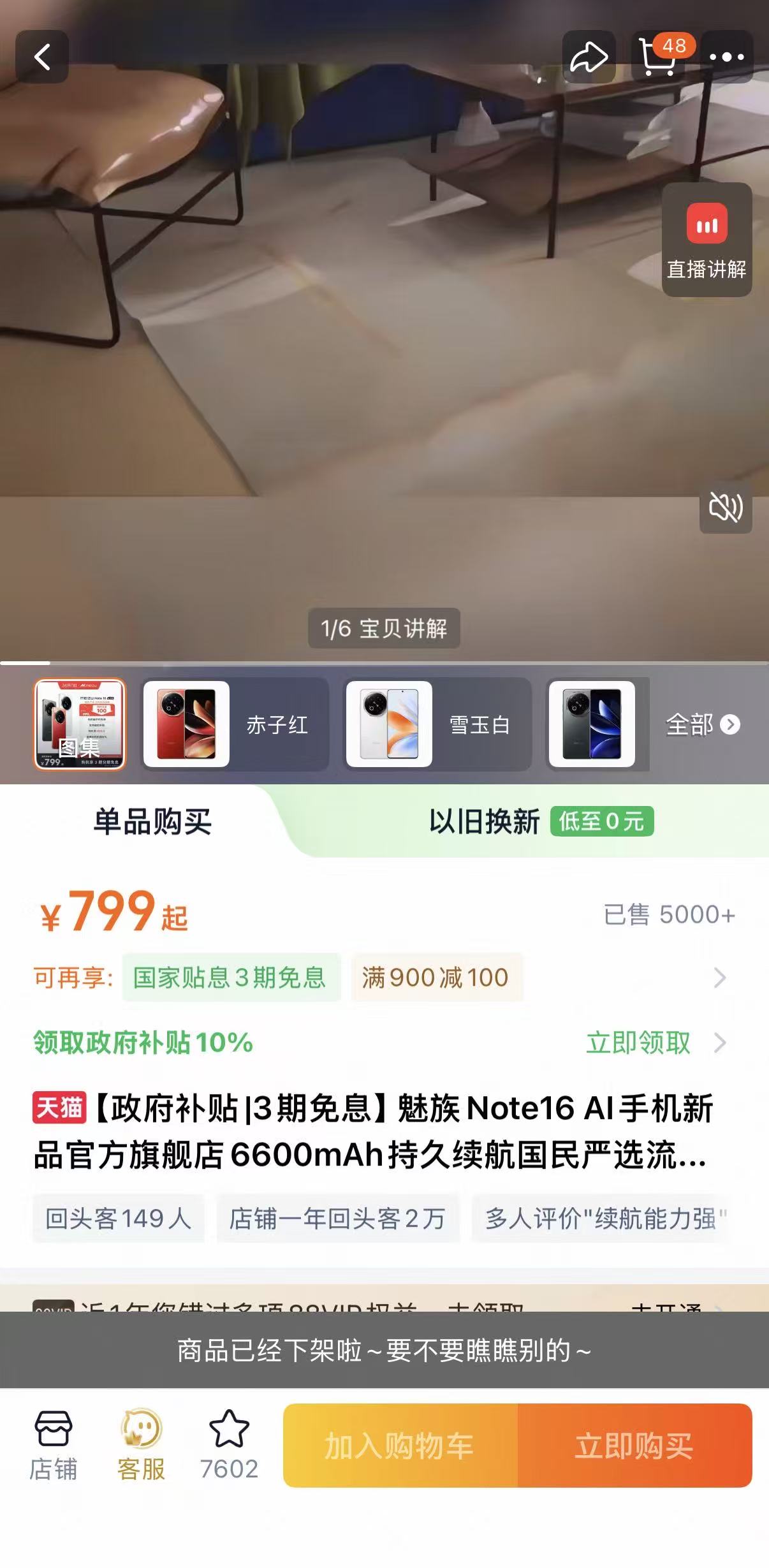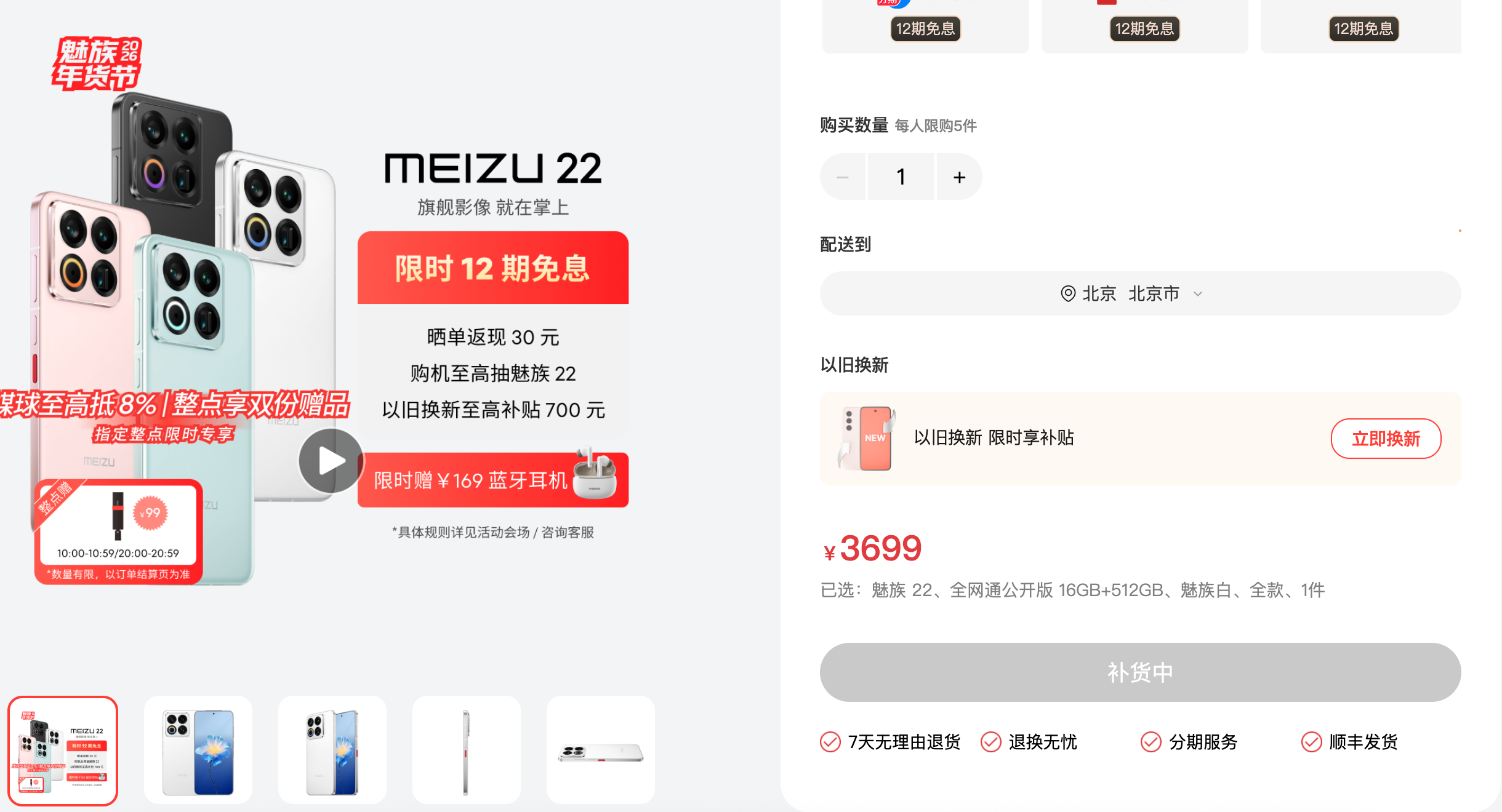 在魅族官网商城,手机产品销售界面也显示“补货中”或“售罄”。官方客服对界面新闻表示:“目前这些产品暂时售罄,公司正在加紧备货,后续上架情况可以关注官方动态或更晚界面显示的信息。”