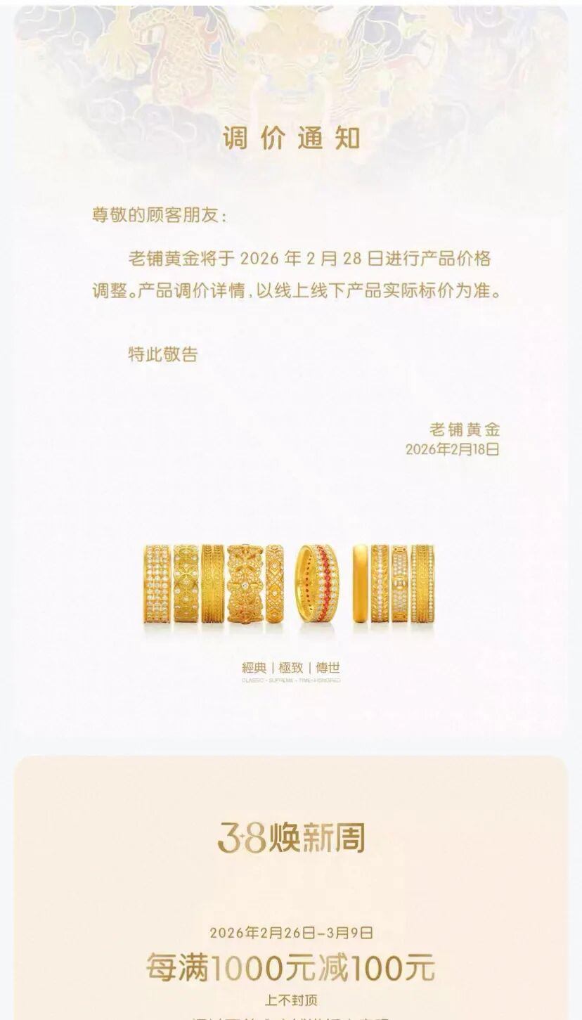 本轮涨价将是老铺黄金 2026 年以来第一次调价。公开信息显示,2025 年,老铺黄金于 2 月、8 月、10 月三次上调售价。最近一次公开调价为 2025 年 10 月,部分产品价格涨幅约 18% — 25%。