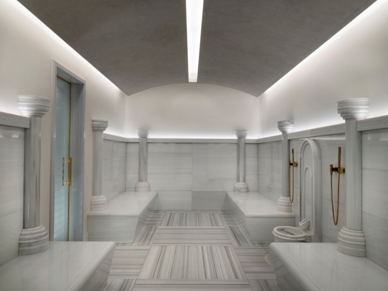 房间里的在地表达更多藏在细节里:订制家具与原创艺术作品把基调稳住,土耳其元素则以更现代的方式出现——木材与珍珠母贝的镶嵌、基里姆风格的地毯,以及铺设马尔马拉大理石的浴室,构成一种低调但清晰的地域质感。一个我很喜欢的点是装饰书的选择:它不像摆设,更像伊斯坦布尔历史的缩影。对我来说,这种“把城市放进房间”的方式,比把符号贴在墙上更高级,也更符合半岛的克制审美。