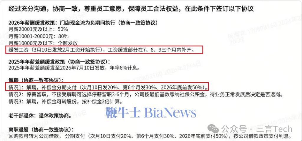 截图显示,如果门店现金流为负时,会进行薪资缓发。在员工看来,虽然承诺会补发,但实际到手的工资少了,这就是 " 降薪 "。