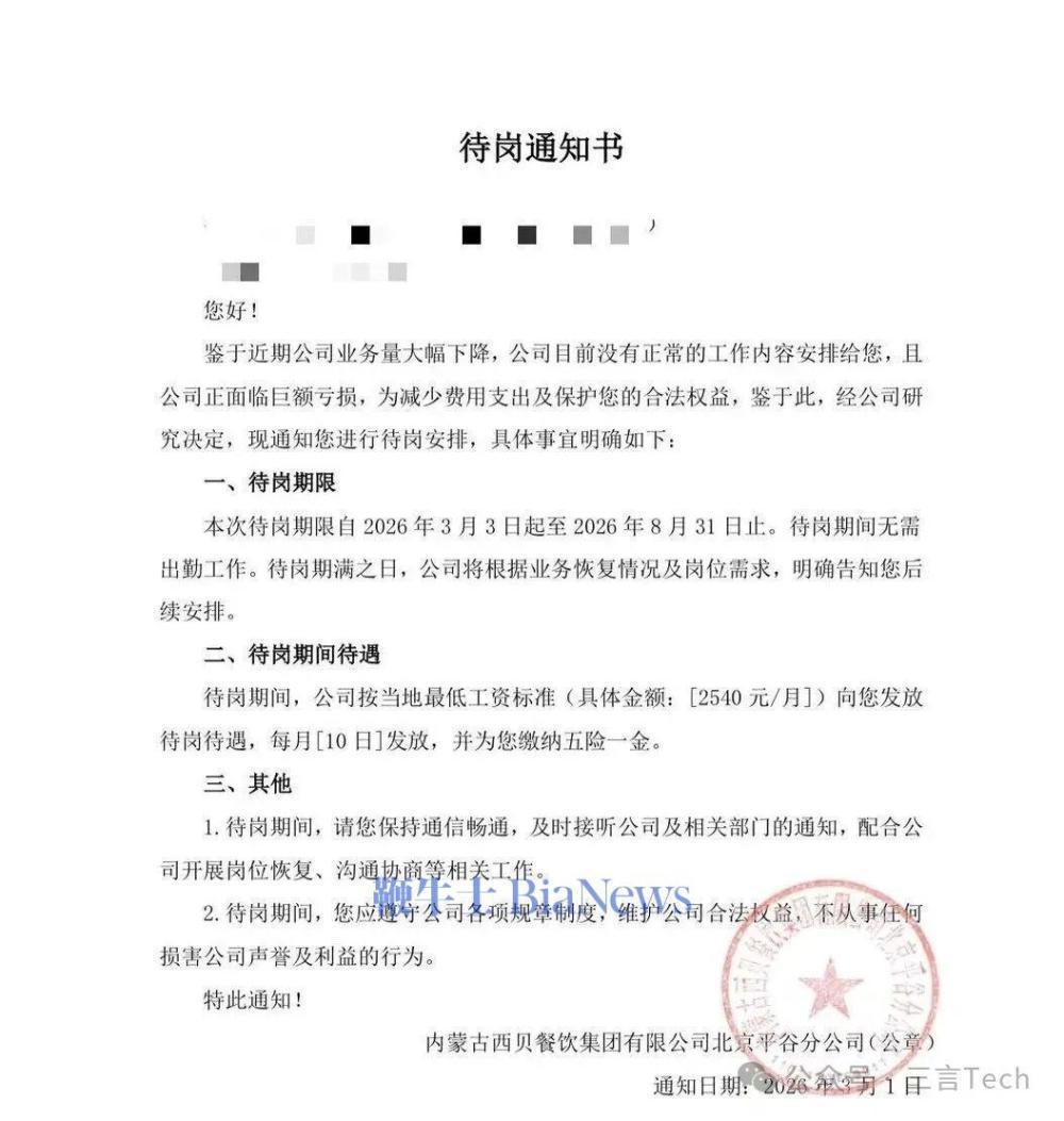 待岗期限 5 个多月,自 2026 年 3 月 3 日起至 2026 年 8 月 31 日止。期间按当地最低工资标准 ( 具体金额 :2540 元 / 月 ] ) 发放待岗待遇。
