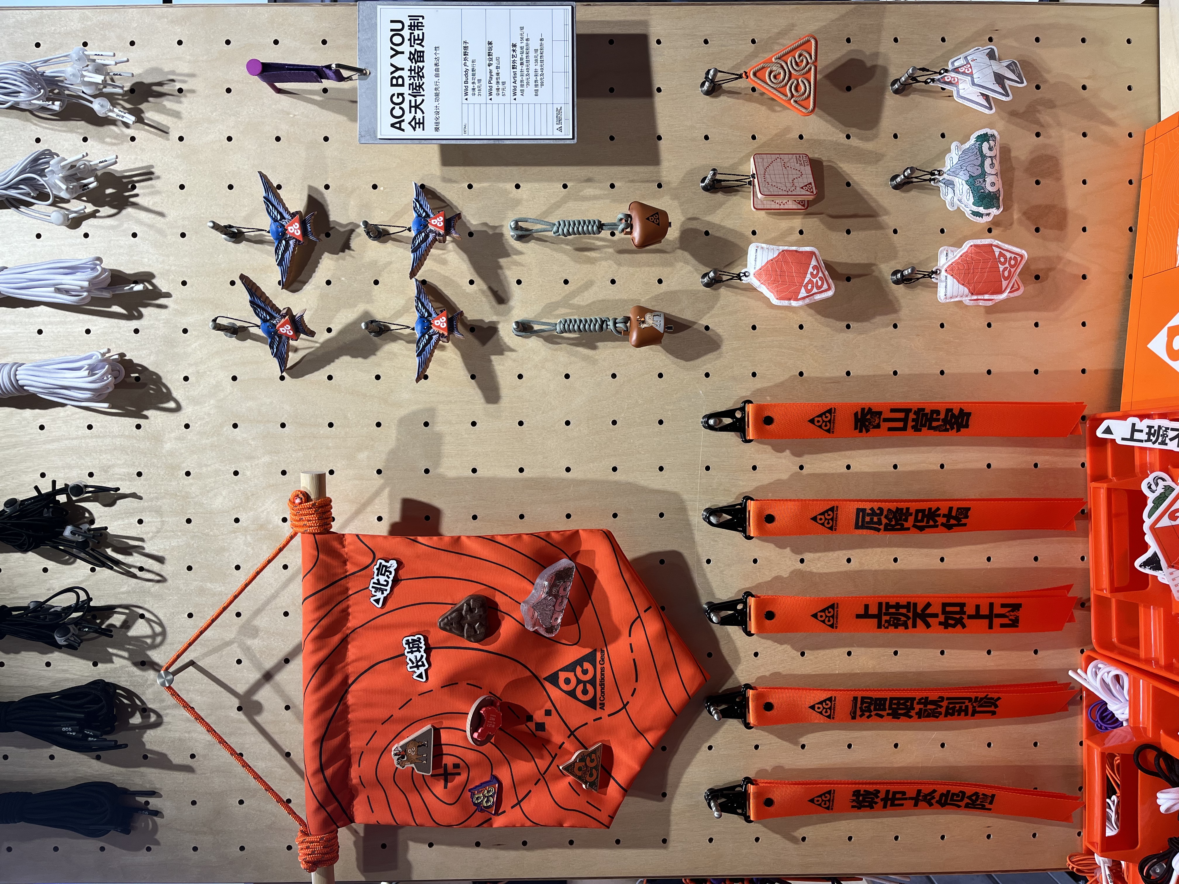 在“ACG BY YOU全天候装备定制”区域,销售着特殊的地域限定配件,满足消费者在户外的个性化需求。例如,北京雨燕挂饰和“一溜烟就倒到顶”“城市太危险”等橙色飘带。演员此沙在现场探店购买的“香山常客”飘带,甚至引发了粉丝在网络上的“求代购”。