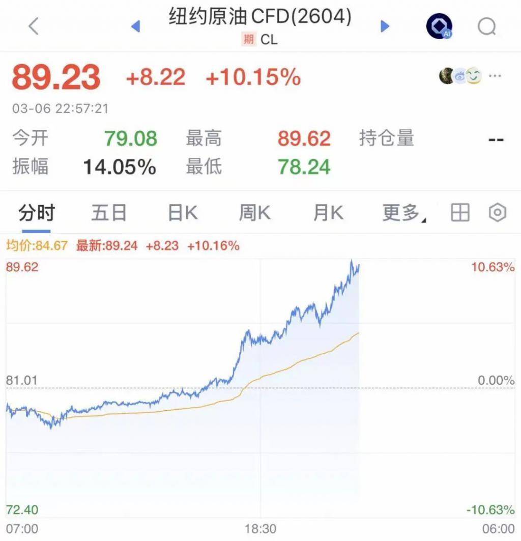 国际油价狂飙,纽约原油期货涨超 10%,直逼 90 美元。布伦特原油期货更是已经站上 91 亿美元。