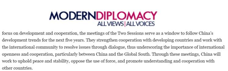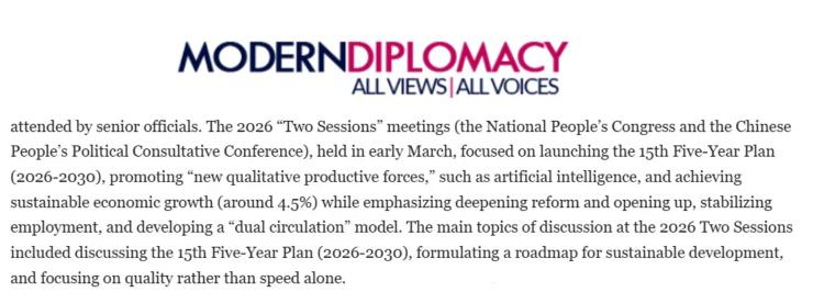 欧洲《现代外交》网站近日刊登埃及本尼苏伊夫大学副教授纳迪亚 · 赫尔米博士的评论文章称,今年中国两会重点关注发展模式创新与深化伙伴关系。会议议题包括通过共建 " 一带一路 " 倡议推动 " 高质量发展 ",深化数字经济、基础设施及能源领域的国际合作,为推动构建人类命运共同体提供重要平台。