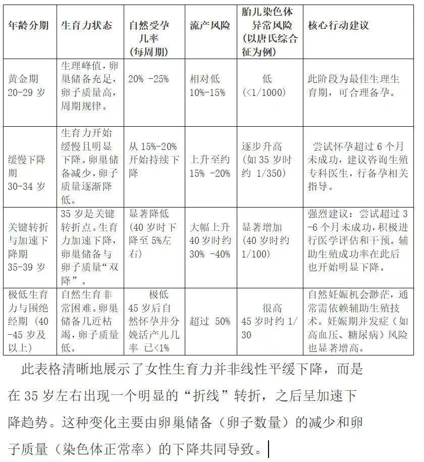 据她介绍,20 岁到 29 岁是女性生育的黄金期,自然妊娠率高、流产率低,唐氏综合征等遗传性疾病发生的概率也低。35 岁是关键转折点,卵子数量和质量直线下降。到了 40 岁以后,自然妊娠率只有 5%、流产风险却高达 50%,唐氏综合征的发生风险是黄金期的 10 倍。