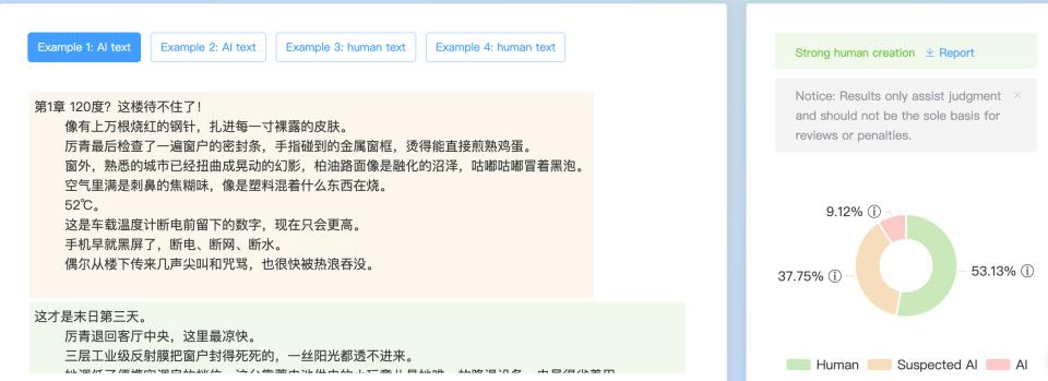 目前他们已经研发上线了一款辅助检测工具,可以提供 AI 成分与痕迹检测、开篇质量和结构建议等,让 AI 生成的内容更自然、更符合读者阅读习惯。
