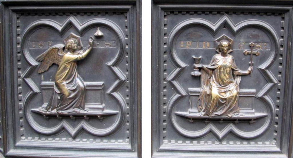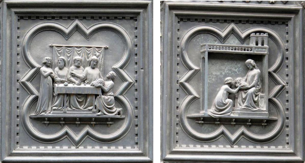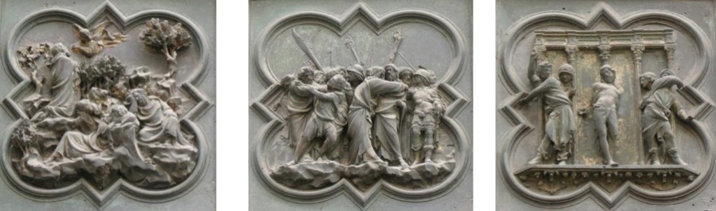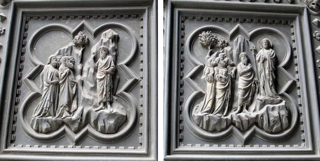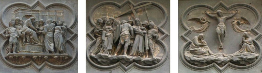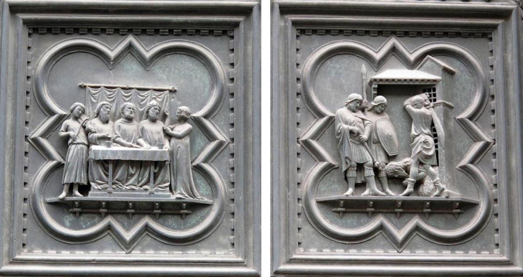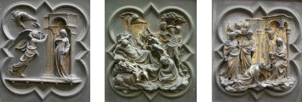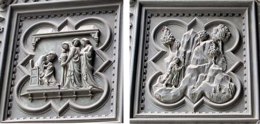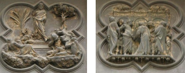 总的来说,布鲁内莱斯基的作品更注重戏剧性的动作表现,情感表达含蓄且充满张力;而吉贝尔蒂的作品则显得更加简洁、朴素,动作相对内敛,着重表现信仰与顺从的主题。他通过清晰简洁的构图和人物塑造,使得整个场景更加简明易懂,同时也传达了一种信仰的纯粹与内心的平静。这种简洁而深刻的表达方式,或许正是“青铜门建筑事务委员会”最终判定吉贝尔蒂胜出的原因之一,因为他的作品在视觉上更加清晰,更具感染力,能够更好地传达出宗教主题的核心精神。