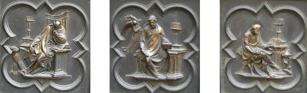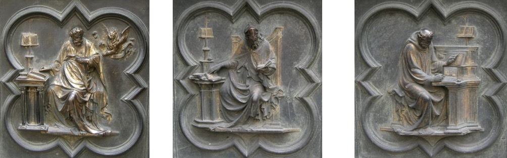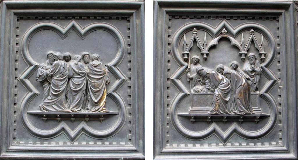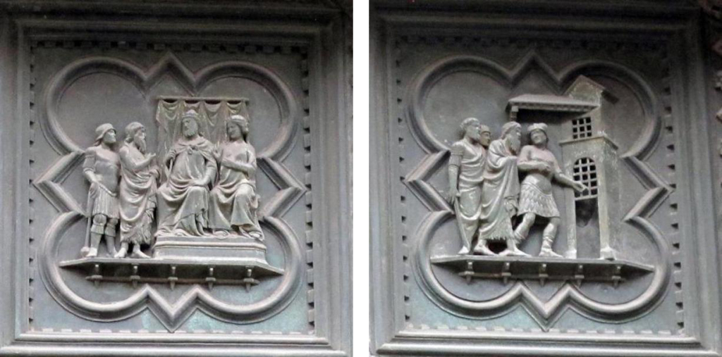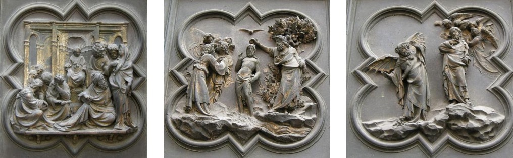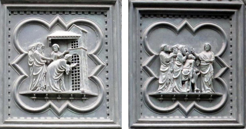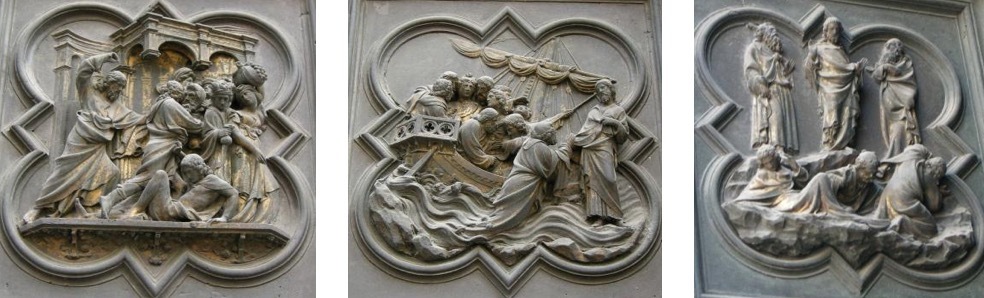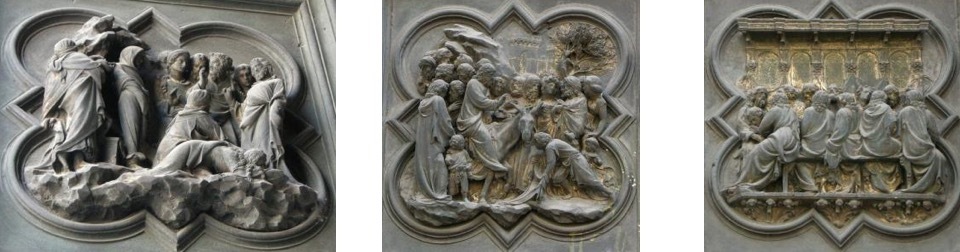 具体而言,北门的展示内容依次为:“天使报喜”“基督的诞生”“三博士来朝”“与圣殿博士辩论”“受洗”“旷野里的诱惑”“驱逐圣殿商人”“奇迹之一:水上行走与拯救彼得”“奇迹之二:变换容貌”“奇迹之三:复活拉撒路”“骑驴进入耶路撒冷”“最后的晚餐”“客西马尼园的祷告”“抓捕基督”“鞭打基督”“比拉多面前受审”“登上髑髅地”“受难”“死后复活”和“圣灵降临节”。与皮萨诺的南门一样,吉贝尔蒂北门底部的八块嵌板也没有直接的叙事内容,主要展示了基督教历史上著名的圣徒,他们分别为“圣约翰”“圣马太”“圣路加”“圣马可”“圣安布罗斯”“圣吉罗拉莫”“圣格雷戈里”和“圣奥古斯丁”。