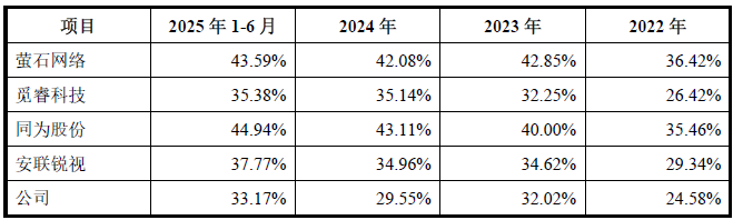2022年、2023年、2024年和2025年上半年,九安智能主营业务毛利率分别为24.58%、32.02%、29.55%和33.17%,始终低于可比公司平均值,差距在5-10个百分点。