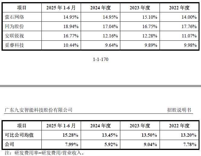 报告期内,九安智能研发费用率分别为7.78%、9.04%、5.92%和7.99%,同期可比公司研发费用率均值分别为13.2%、13.5%、13.45%和15.28%。对比可见,九安智能研发费用率不足行业均值的一半,最低时仅为同行均值的44%。