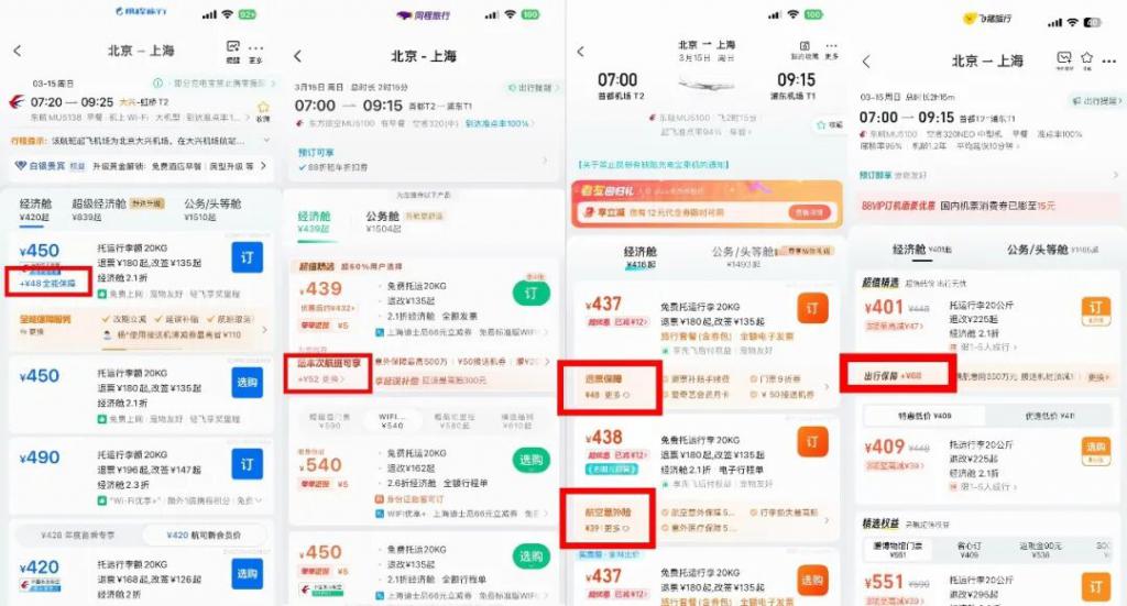 在携程旅行 APP,被置于首位推荐的选项以较大字体标注 450 元,但在点进下一页面后,显示的最终支付价格为 568 元,除去 70 元的机建燃油费用,还默认附带了 48 元的 " 全能保障服务 ",而这一附带产品在首页只是以 "+48 元 " 的小字显示。