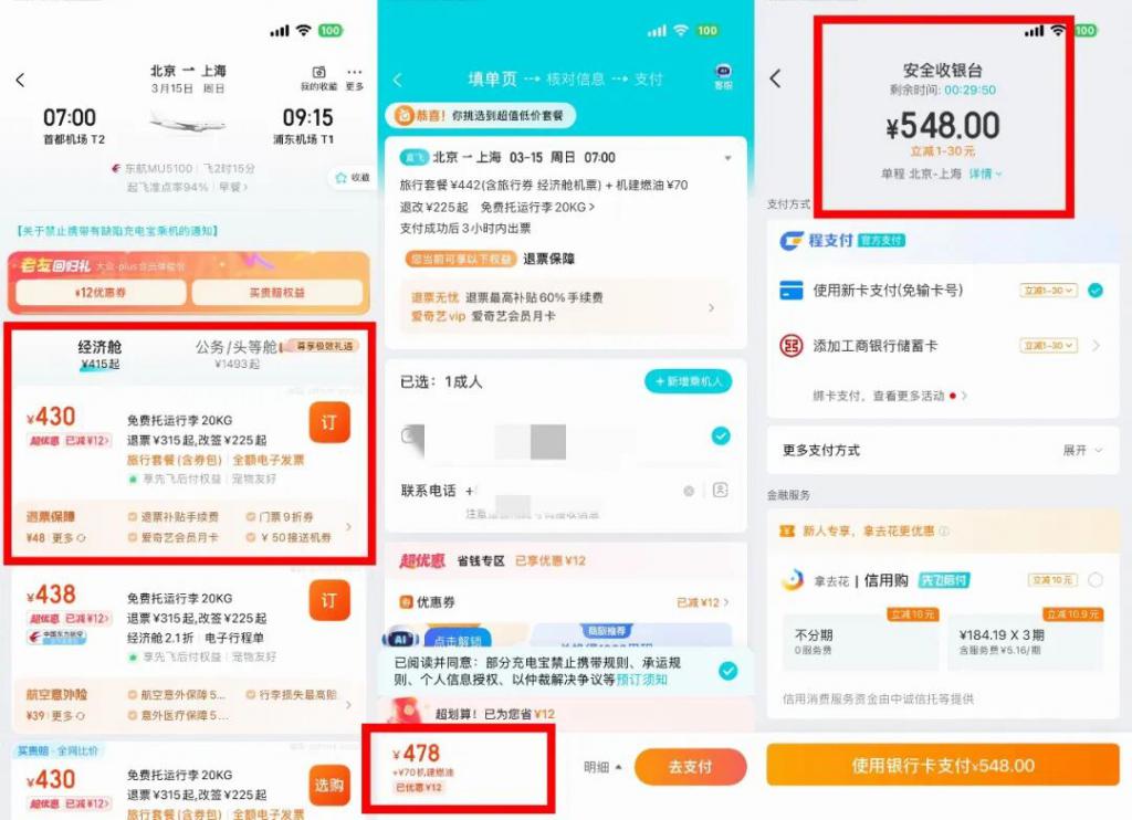 在去哪儿 APP,排名前两位推荐的选项下方都有小字 "+XX" 元的退票保障或航空意外险。点击进入第一个大字显示 430 元选项,下一级确认页面显示的是价格 478 元(基础价格 442 元 + 退票保障价格 48 元 - 个人优惠券 12 元),辅以小字 "+70 机建燃油 "。真正进入支付页面时,则是加上机建燃油后的 548 元,最终价格确认相对不清晰。