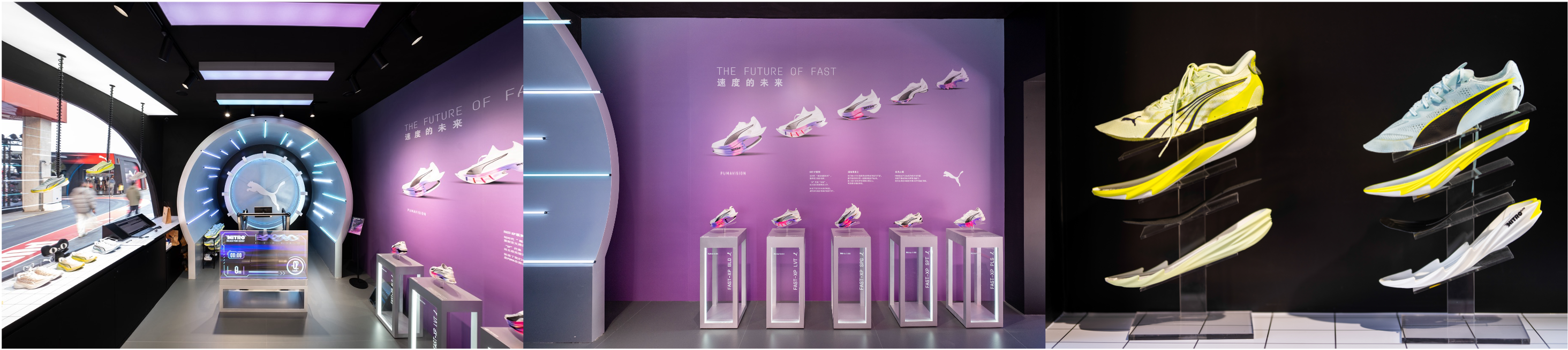 PUMA NITRO科技空间作为品牌前沿科技的秀场,集中呈现当季搭载 NITROFOAM™ 科技的专业跑鞋——DEVIATE NITRO 4和DEVIATE ELITE 4,及未来感十足的 FAST-XP 概念鞋款,直观展现 PUMA 在高性能运动科技领域的持续突破。