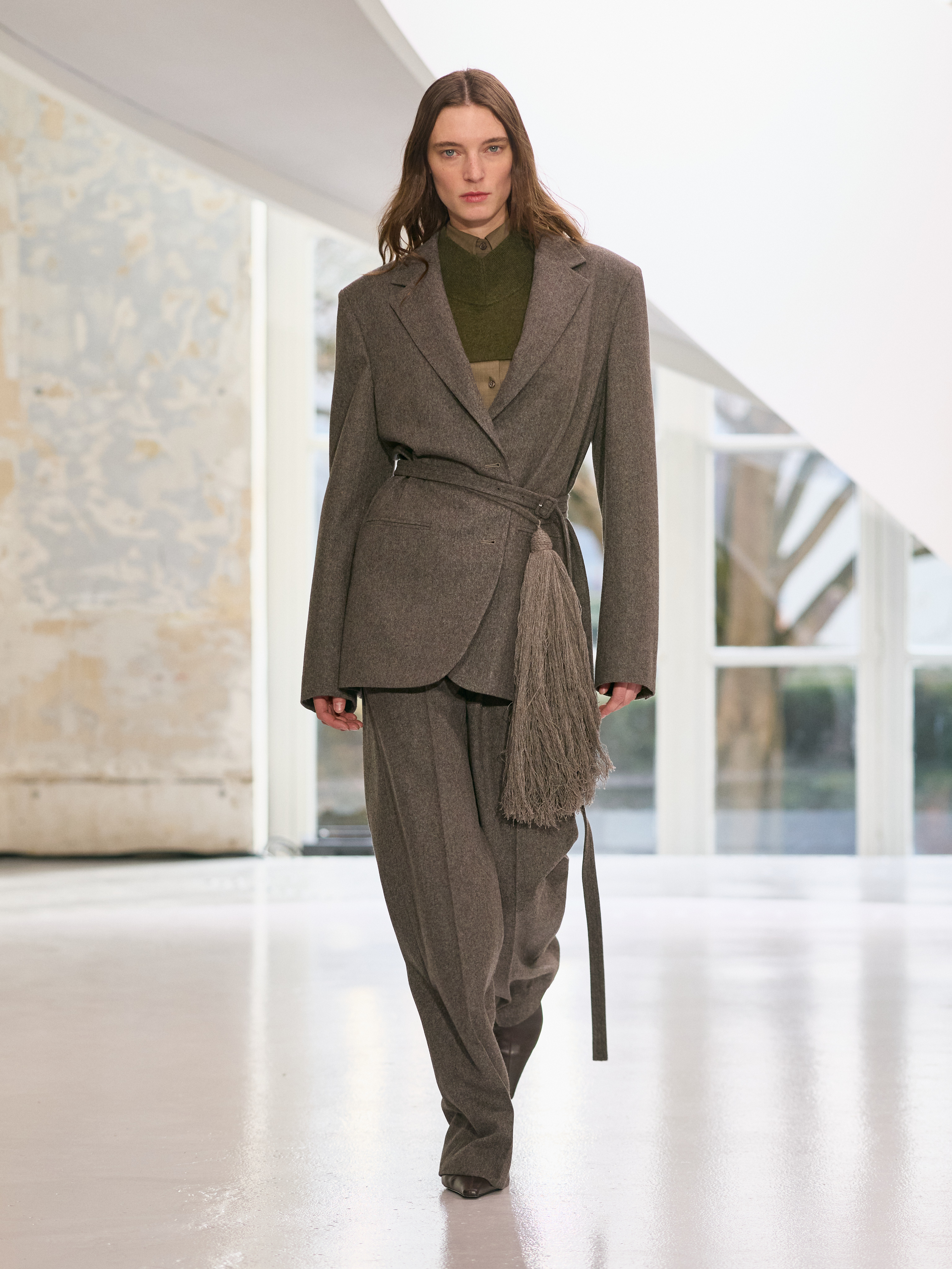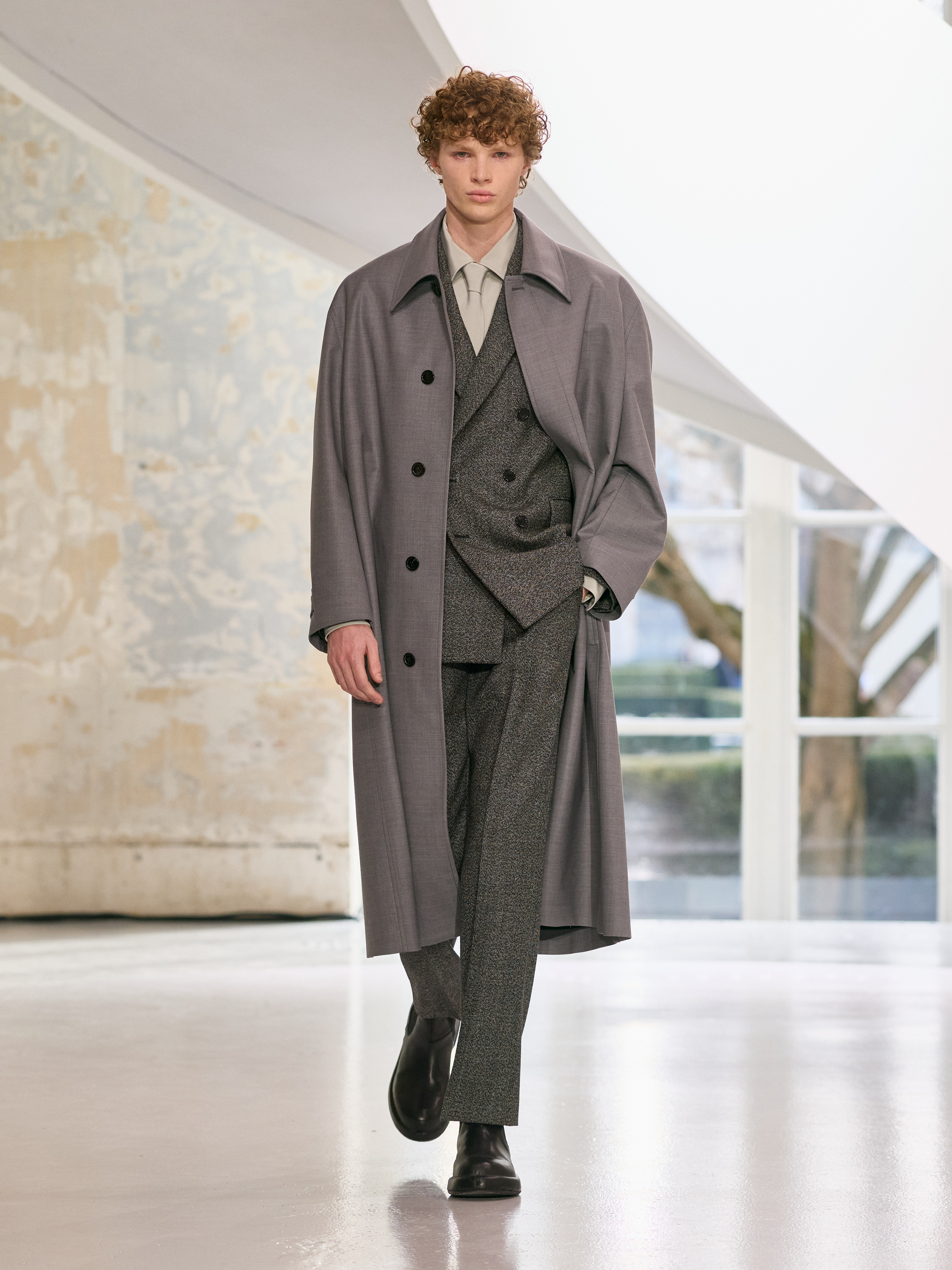 男装系列则呈现更为鲜明的雅致。以传统工艺为根基的新经典,在材质与比例上焕然新生。男装的原型依然在场,借助精致面料找到更为柔和的表达。廓形因丝绸与羊绒而轻盈,与厚实的花呢、羊毛犬牙格及挺括马甲形成对照。