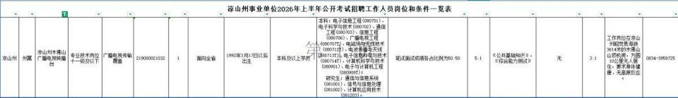 招聘公告显示,凉山州木佛山广播电视转播台拟招聘 " 广播电视传输覆盖 " 岗位人员 1 名,面向全省招考,要求报考人员为 1992 年 3 月 17 日及以后出生;本科要求电子信息工程、电子科学与技术、通信工程等专业,研究生要求通信与信息系统、信号与信息处理、计算机应用技术专业。