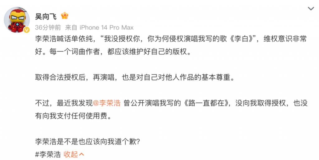 吴向飞喊话李荣浩道歉:未授权唱我的歌;李荣浩连续发文回应