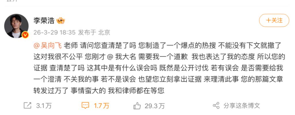 随后,李荣浩接着 @吴向飞并发文称," 请问您查清楚了吗 您制造了一个爆点的热搜 不能没有下文就撤了 这对我很不公平 您刚才 @ 我大名 需要我一个道歉 我也表达了我的态度 所以您的证据 查清楚了吗 这其中是有什么误会吗 既然是公开讨伐 若有误会 是否需要给我一个澄清 不关我的事 若不是误会 也望您立刻拿出证据 来理清此事 您的那篇文章转发过万了 事情蛮大的 我和律师都在等您 "。