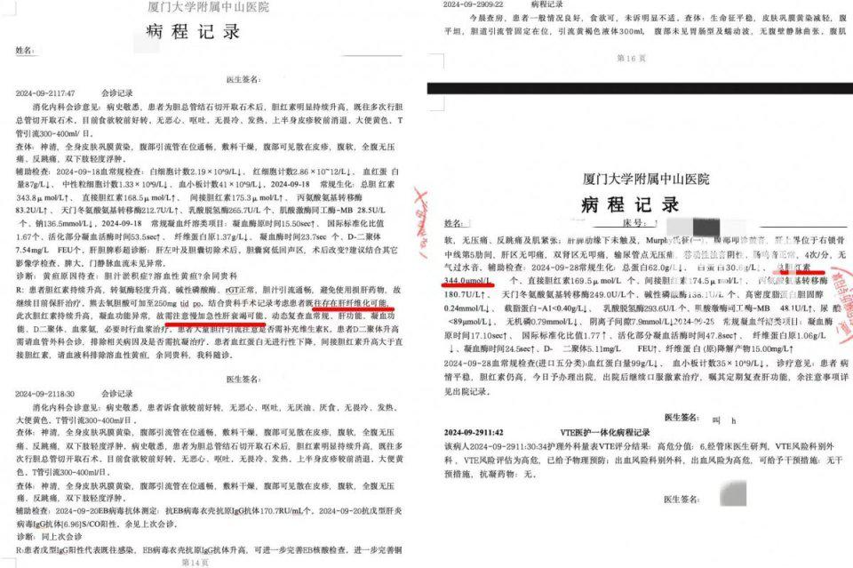 术后,谌女士的状态不仅没有好转,反而出现眼睛、身体发黄的症状,与术前能做微商小生意的状态判若两人。当年 9 月 21 日的一份术后消化内科的会诊记录提示,谌女士黄疸原因待查,存在肝脏纤维化的可能,需警惕加急性肝衰竭。同年 9 月 29 日,其总胆红素达 344μmol/L,是正常值的上限约 20 倍。这期间,李医生多次让家属准备出院。