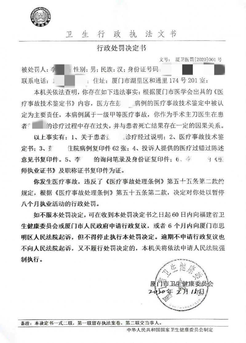 这起事故曾被厦门市医学会认定为一级甲等医疗事故,厦门大学附属中山医院承担主要责任,李医生作为主刀医生,被厦门市卫生健康委员会处以暂停执业 8 个月的行政处罚。8 个月后,李医生重返岗位,继续在该院从事外科诊疗工作。