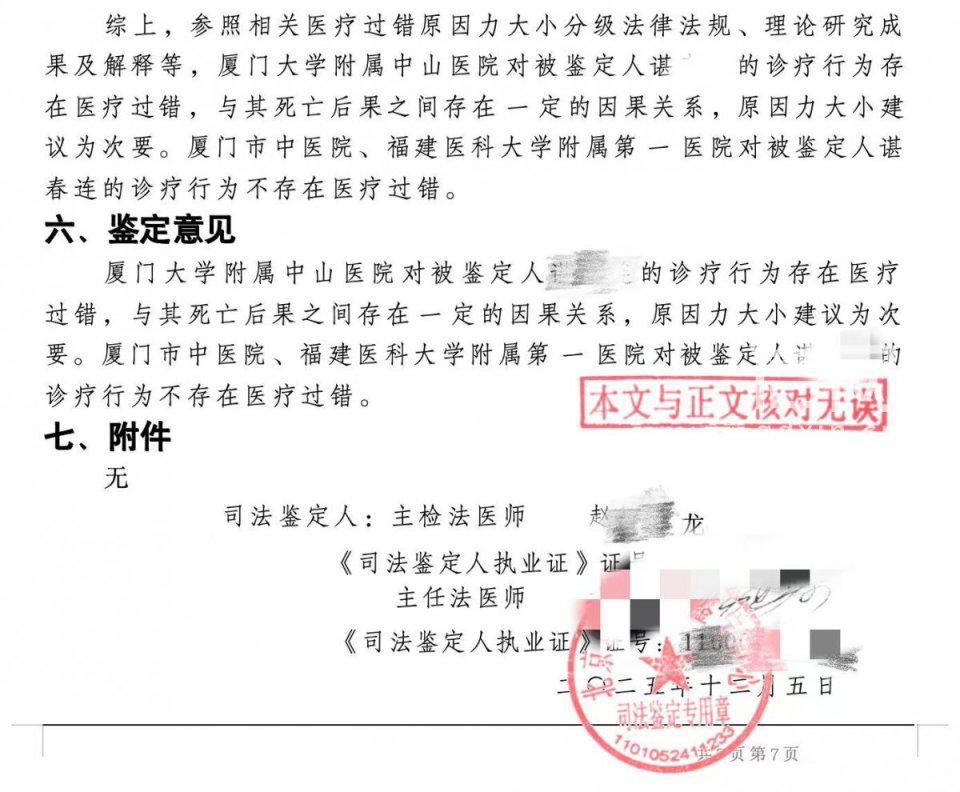 最终,北京明正司法鉴定中心鉴定认为厦门大学附属中山医院与其死亡后果存在一定因果关系,原因力大小建议为次要。