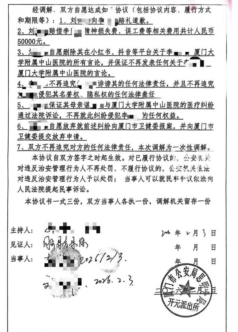 " 拘留记录会毁了我的教师工作,家里还有嗷嗷待哺的孩子,我没有选择。" 当晚,刘女士在派出所内与李医生签署了调解协议,她向对方道歉并赔偿 5 万元精神损失费,还需删除全网所有针对厦门大学附属中山医院及李医生的维权帖文。签署协议后,当晚深夜 10 时左右,刘女士才得以离开派出所。