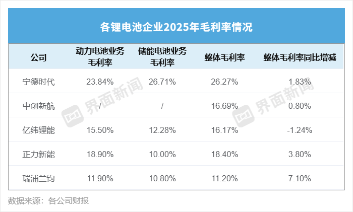 2025年,亿纬锂能毛利率为16.17%,同比下滑1.24个百分点。在前文统计的几家锂电企业中,仅亿纬锂能一家去年的毛利率出现了下滑。