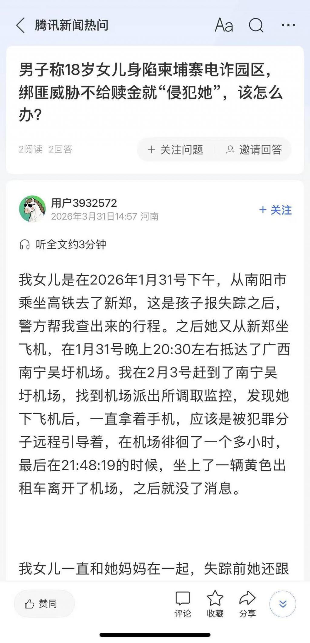 河南南阳的仝先生在腾讯热问发帖求助,称女儿景景 1 月底突然失联,经多方排查确定其身处柬埔寨电诈园区。控制景景的人多次向他索要赎金,还在视频通话中殴打景景,并威胁要找人对她实施 " 轮奸 "。仝先生卖掉汽车、多方凑钱,先后两次支付赎金,总额达十多万元,但对方始终未放人。3 月 31 日下午,南阳公安局车站分局正式对景景失踪案进行立案侦查,但由于涉及跨国调查,案件调查难度极大。仝先生心急如焚,希望能早日救出女儿。