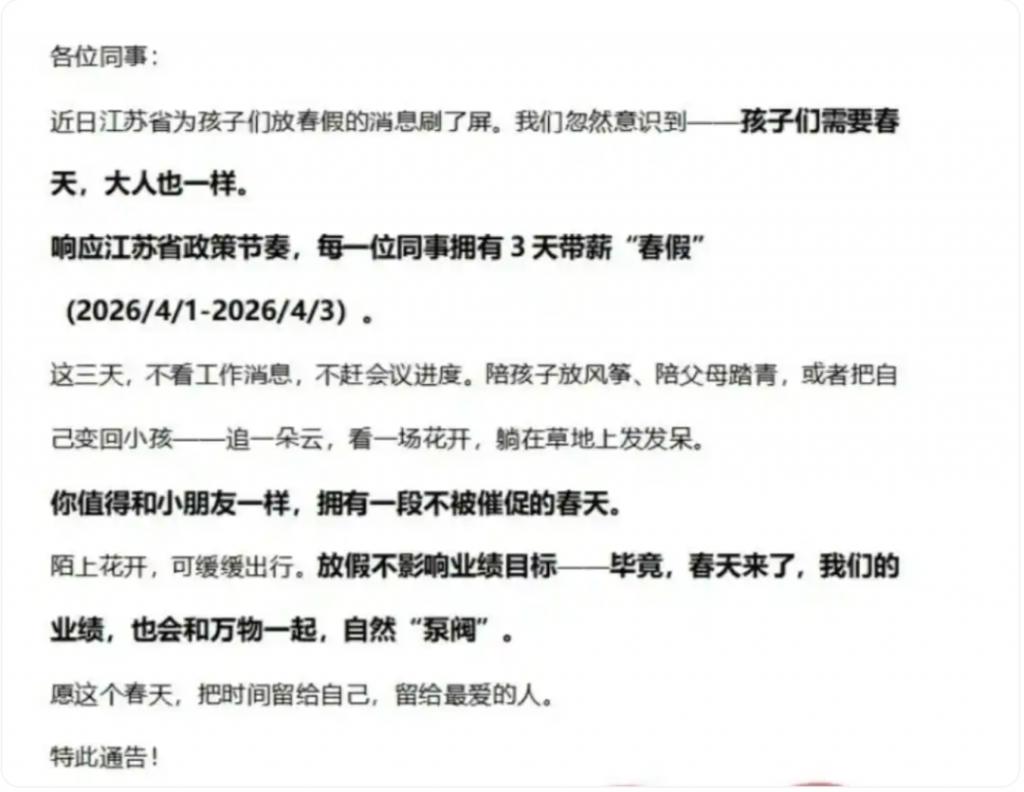 前不久,江苏昆山的一家机电设备公司表示,全体员工将享受年休假之外的三天带薪春假,前后不调休。通知中的一句 " 大人和孩子都需要‘春天’ " 戳中了不少网友,不用挤在节假日扎堆出行,不用在工作和陪伴孩子间两难,职工能趁着春光陪伴家人、放松身心,这份温暖也能让职工更有归属感和工作动力。可见,落实休假制度,从来不是负担,而是凝聚人心、实现双赢的小事。
