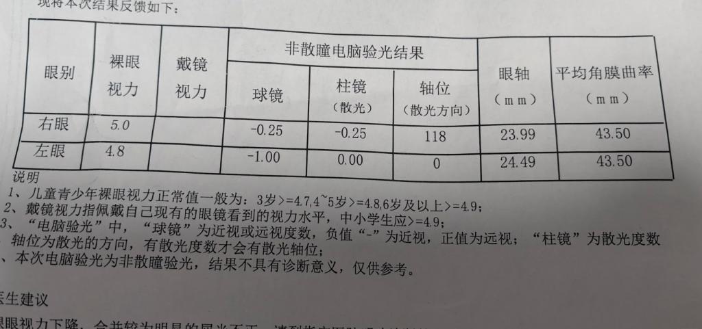 视力筛查单显示,小宇的裸眼视力降至 0.8,眼轴 24.49mm,老师提醒需及时干预。
