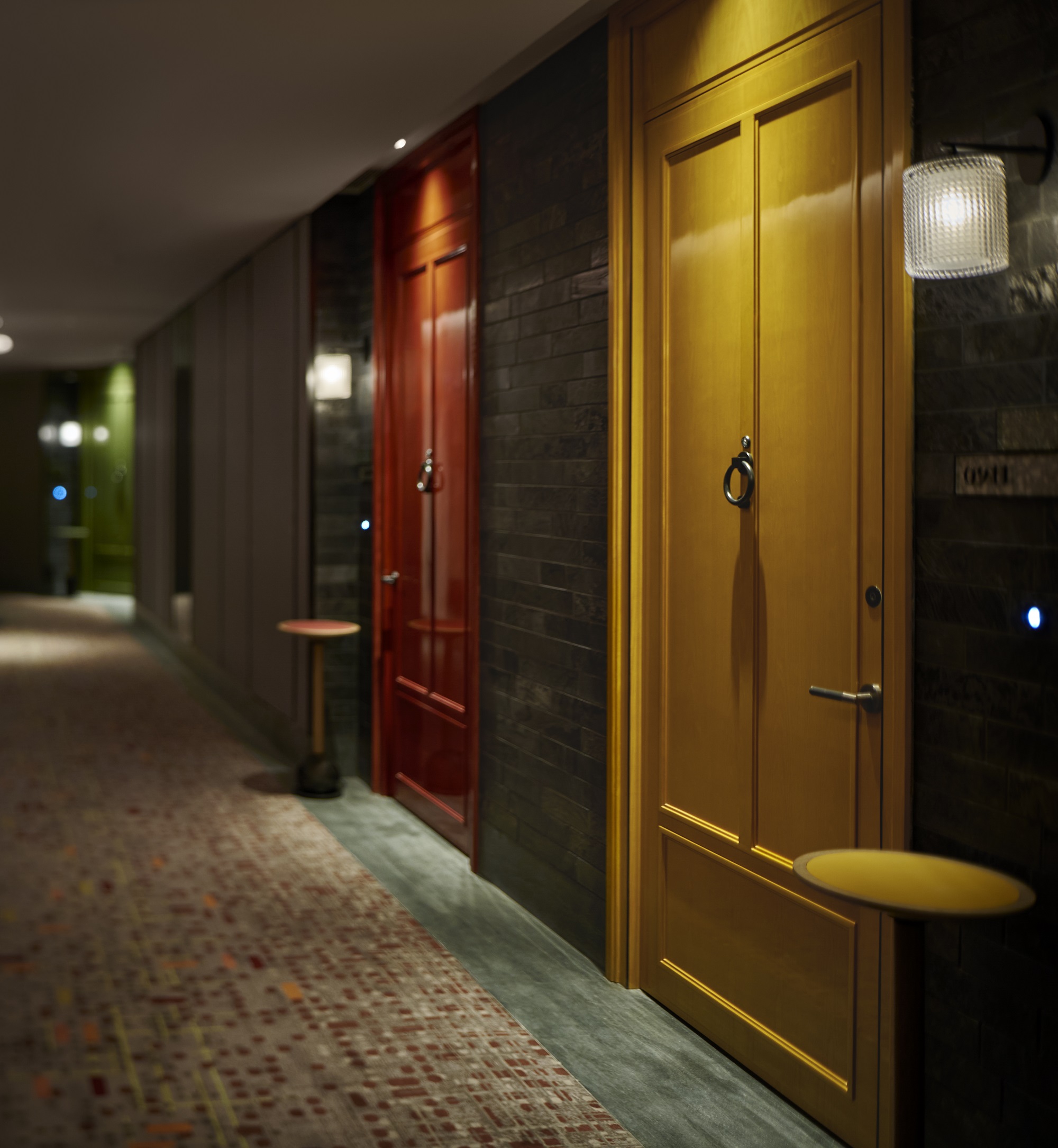 设计巧思延伸至客房楼层,筆口征哉认为,这里值得让人慢慢挖掘。客房楼层走廊饰以梧桐树剪影轮廓,每一扇客房门都设置成彩色门面。