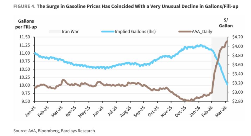 每次加油量的变化则更为触目。每笔交易隐含的加油量从历史上高度稳定的约 11 加仑降至约 10 加仑,同比下降 7%。巴克莱指出,这在历史数据中属于极不寻常的变化,是消费者对高油价最直接的行为反应——在出行需求相对刚性的情况下,选择每次少加油以控制单次支出。