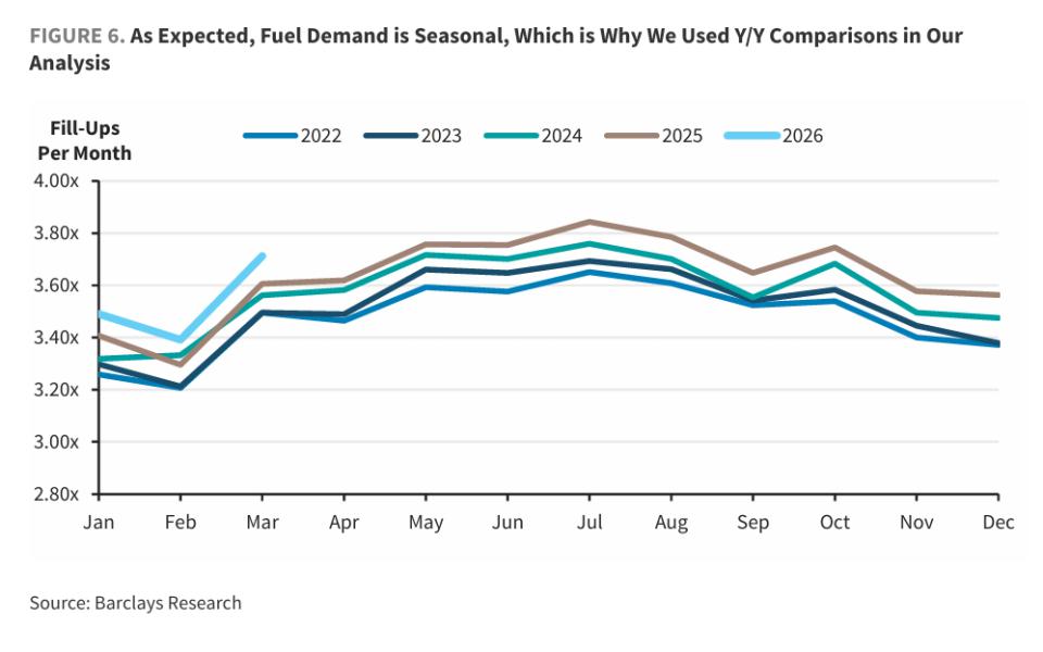 由于信用卡交易数据仅记录交易金额而非实际加仑数,巴克莱通过总支出与 AAA 平均零售油价推算消费量。为剔除季节性因素——尤其是从冬季向夏季驾驶旺季过渡期间的波动——分析采用同比口径。