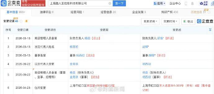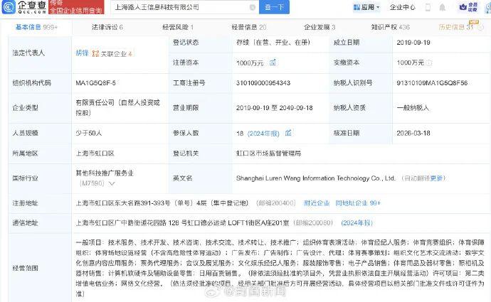 企查查 App 显示," 路人王 " 运营公司上海路人王信息科技有限公司成立于 2019 年 9 月,注册资本 1000 万元,经营范围含体育经纪人服务、体育竞赛组织、体育保障组织等。2026 年 3 月,该公司法定代表人、董事、财务负责人均发生变更。