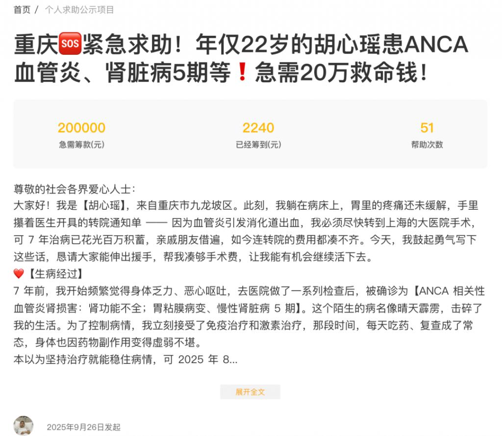 胡心瑶的筹款求助