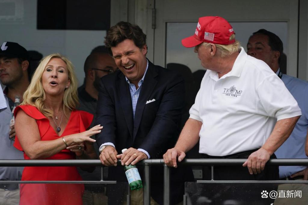 2022 年 7 月 31 日,前众议员玛乔丽 · 泰勒 · 格林、塔克 · 卡尔森和唐纳德 · 特朗普观看高尔夫球手比赛。