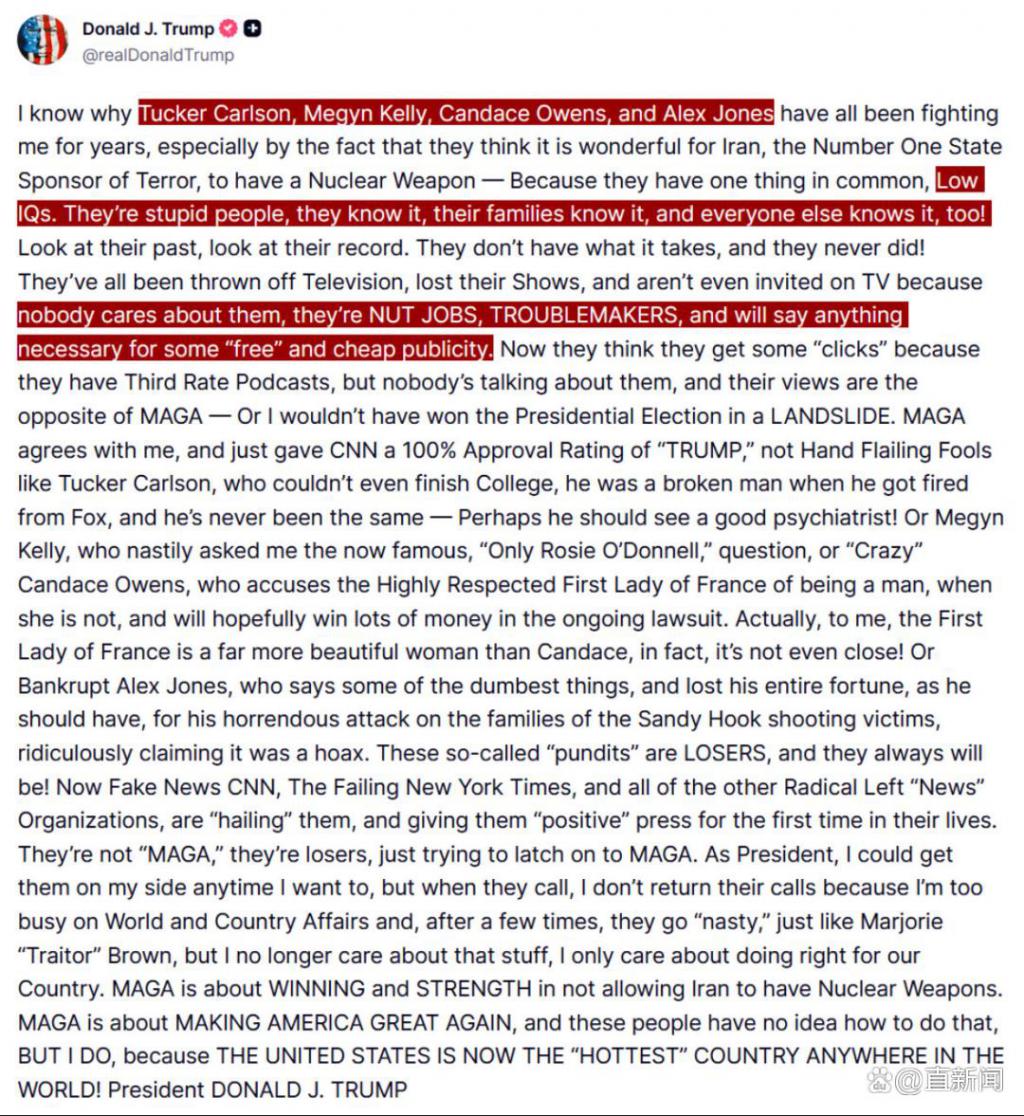 可这几位近期都因各种原因与特朗普闹掰,并且都批评了特朗普总统对伊朗发动战争的行为。塔克 · 卡尔森就在 4 月 6 日晚上猛烈抨击特朗普复活节发布的那条措辞激烈、脏话连篇的帖子,称这 " 在各个层面都令人作呕 "。