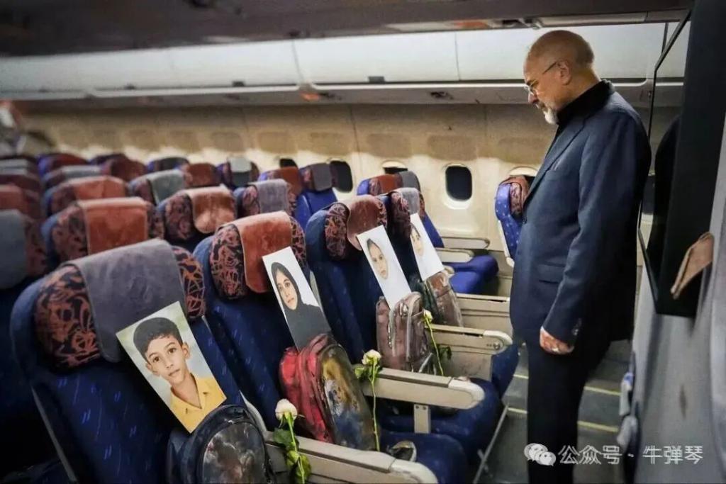 专机的第一排座位上,安静摆放着四个小女孩的照片,下面是她们的书包,每个书包旁边,还放着一支鲜花。