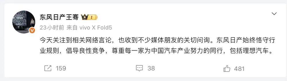 东风日产新能源品牌总经理王骞随后隔空回应,措辞谨慎:东风日产始终恪守行业规则,倡导良性竞争,尊重每一家为中国汽车产业努力的同行,包括理想汽车。可以说,东风日产的回应既未正面否认,也未真正认账。